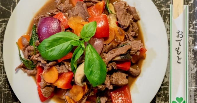 • Beef stir-fry with vegetables and thai basil / Wokban készült marha, zöldségek, thai bazsalikom