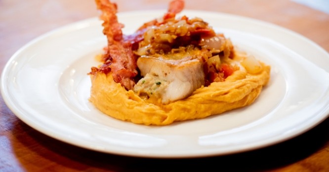 - Pike perch fillet, mashed potatoes with paprika, vegetable stew