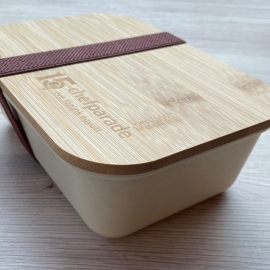 PP műanyag ételdoboz, gravírozott Chefparade logos bambusz tetővel és rugalmas textílpánttal. 1000 ml űrtartalom. Mosogatógépben is mosható.